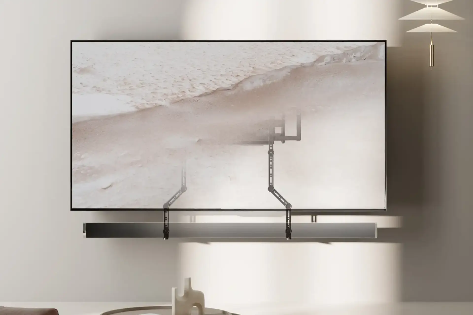 This universal soundbar bracket can mount the majority of soundbars directly to the TV using the VESA mounting holes at the back. The included but optional L shaped brackets provide a shelf that can support soundbars that don't have dedicated mounting points.