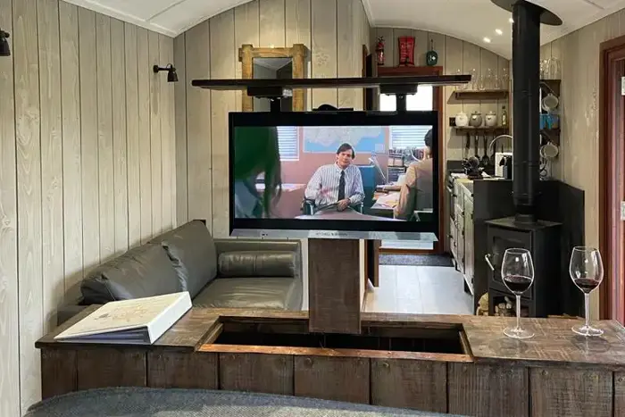 The owner of a Shepherds hut reached out to get a Sabaj Rotolift for their holiday venue. Given the small size of these huts, they wanted to install only one television which presented a problem for the room layout. By using a Rotolift installed into an end of bed tv cabinet, the TV can be angled by remote control and is viewable from all corners of the Shepherds Hut, providing the ideal solution.